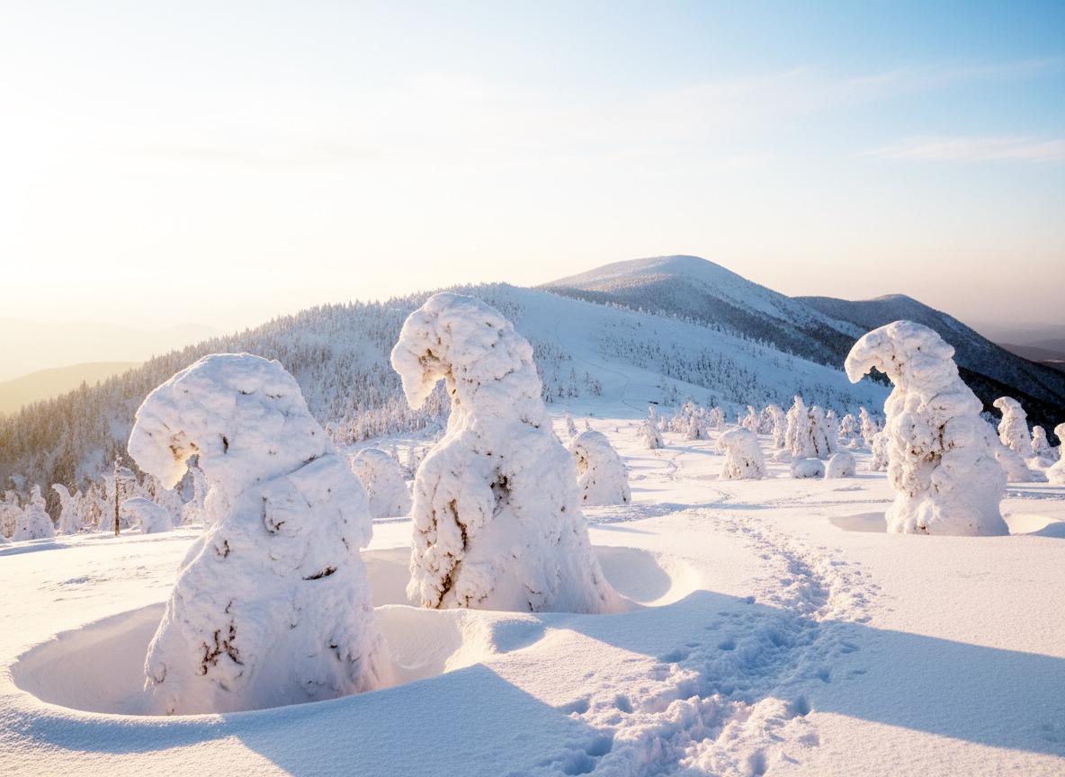 蔵王(山形県): 日本最大級の「スノーモンスター」を間近で!夜間の雪上車ツアーもあり、期間限定でライトアップも楽しめます。